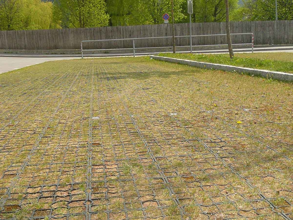 Auf einer Fläche von 2.600 m² wurden unsere Ecoraster E55 verlegt, begrünt und mit Parkplatzmarkierungen versehen.